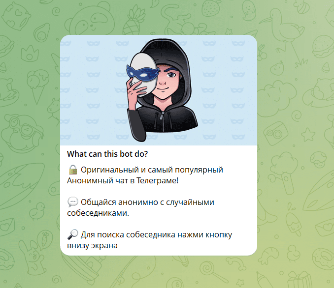 Бот предлагает базовые инструменты для анонимного общения и смены собеседников, с несколькими опциями персонализации.