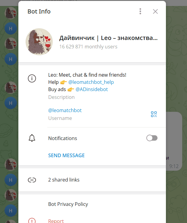 LeoMatchBot (ранее известный как «Дайвинчик») — это один из самых популярных Telegram-ботов для знакомств в СНГ, с ежемесячной аудиторией более 16 миллионов пользователей. Он предлагает простой и интуитивно понятный процесс знакомства: создание анкеты, просмотр профилей других пользователей и возможность начать общение при взаимной симпатии. Бот ориентирован на поиск как романтических, так и дружеских отношений.