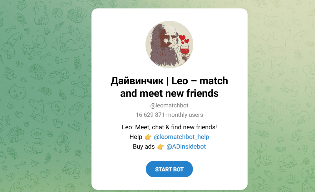 LeoMatchBot (ранее известный как «Дайвинчик») — это один из самых популярных Telegram-ботов для знакомств в СНГ, с ежемесячной аудиторией более 16 миллионов пользователей. Он предлагает простой и интуитивно понятный процесс знакомства: создание анкеты, просмотр профилей других пользователей и возможность начать общение при взаимной симпатии. Бот ориентирован на поиск как романтических, так и дружеских отношений.
