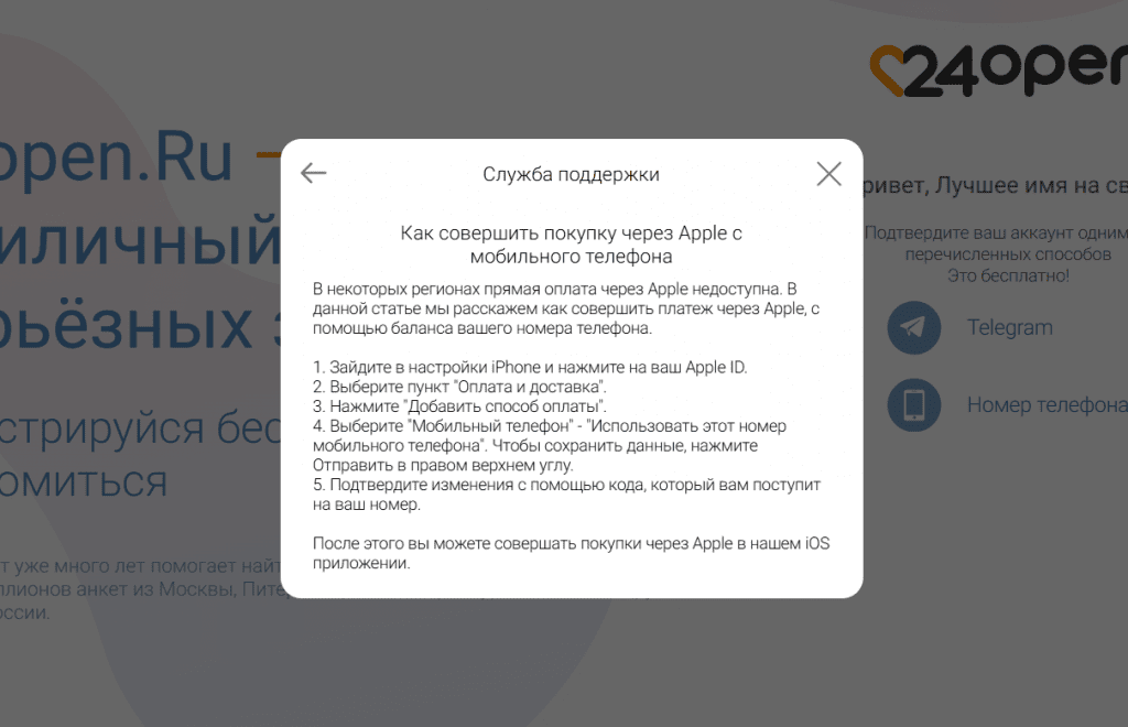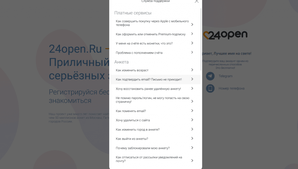 24open.ru позиционирует себя как платформа для серьёзных знакомств, на которой люди могут найти пару как для общения, так и для отношений. По заявлению проекта, в базе — более 50 млн анкет из разных городов России, доступна бесплатная регистрация и верификация аккаунта. Сайт предлагает традиционные функции — профили, переписку, фильтры, мобильную версию — с акцентом на широкое географическое покрытие и длительный срок существования на рынке.