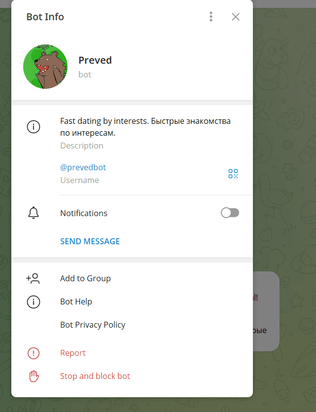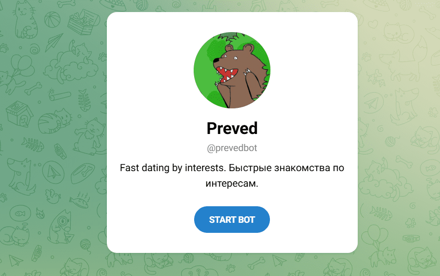 PrevedBot — это Telegram-бот, ориентированный на быстрые знакомства по интересам. Он предлагает пользователям анонимное общение с возможностью выбора собеседников на основе общих увлечений. С помощью команд /go