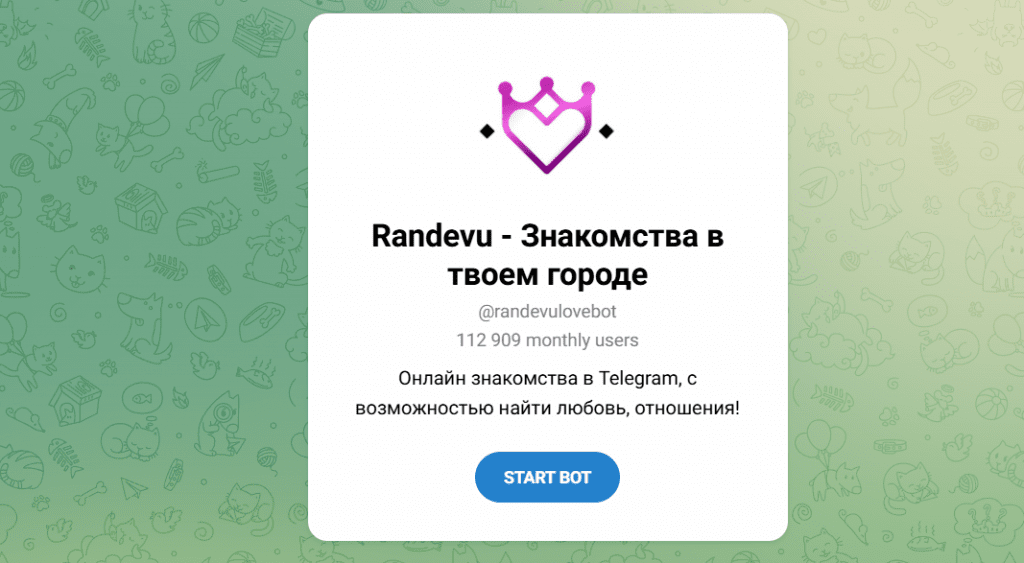 Randevu – Знакомства в твоем городе — популярный Telegram-бот для онлайн-знакомств, объединяющий более 100 тысяч активных пользователей. Сервис подбирает пары по городу, возрасту и интересам, позволяя начать диалог буквально в один клик. Формат построен на идее простоты и локальности: никаких сайтов и регистраций — всё общение происходит прямо в чате Telegram.