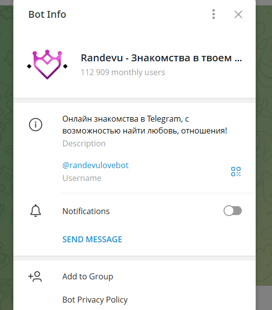Randevu сочетает удобный интерфейс, быстрый поиск и геолокацию. Это один из самых живых ботов для знакомств, где легко найти собеседника рядом.