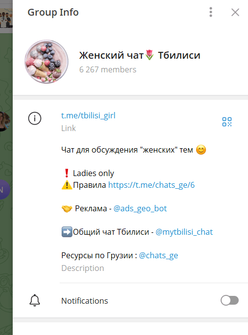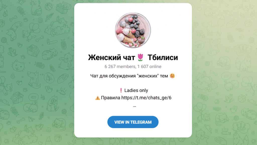 - Чат @tbilisi_girl является бесплатным для участия. Однако доступ к чату ограничен, и вступление возможно только по приглашению. Некоторые участницы сообщают, что для получения приглашения необходимо активно участвовать в других женских чатах или быть рекомендованной участницей, уже состоящей в чате.